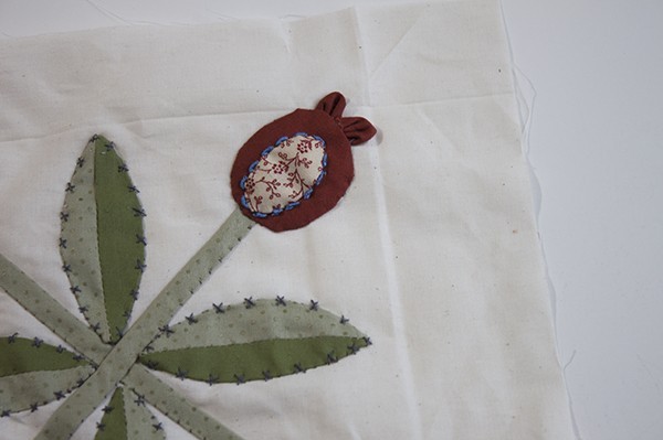 To applique the flowers, I worked the same way each piece to make the flower as I did with the leaves, I used the paper template inside in the back of each piece then I did the hand applique.