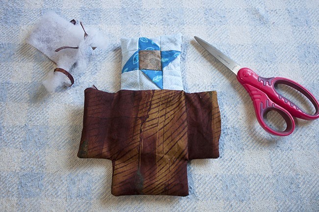 Trim the piece, leave the 1/4″ for the seam and make a little cuts in all the angles, cut diagonally all the points. Turn the piece out and with the help of the scissors push the corners out (gently push).