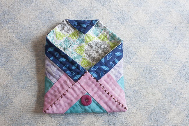And make a few stitches to sew the fold to the mini quilt. Make a button hole, I show you how to do it on the video and sew a button on the mini pouch.