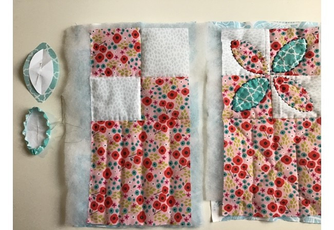 Lay the piece on one square on one of the quilted pieces, pinch one pin and do the hand applique of 3/4 of the piece, remove the pin and remove the paper template, arrange the seam allowance and finish the applique of this piece.