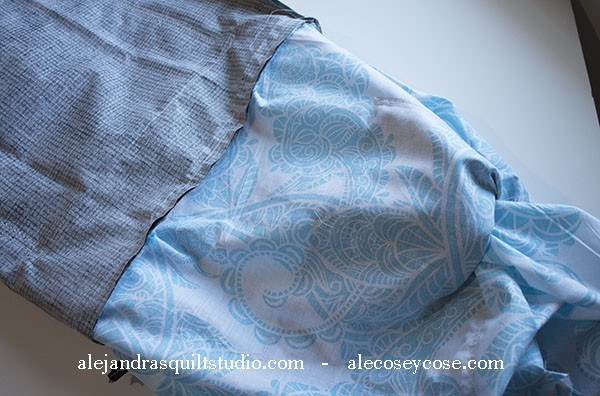 5. On this picture you can see a close up of the patchwork pocket, I did a regular stitch first right next to the blue bias, then I did a second stitch on the three sides of the pocket.